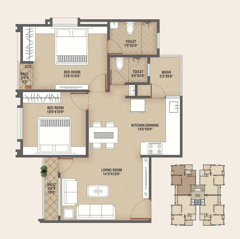 2 BHK SBA - 1040.00 SQ.FT.